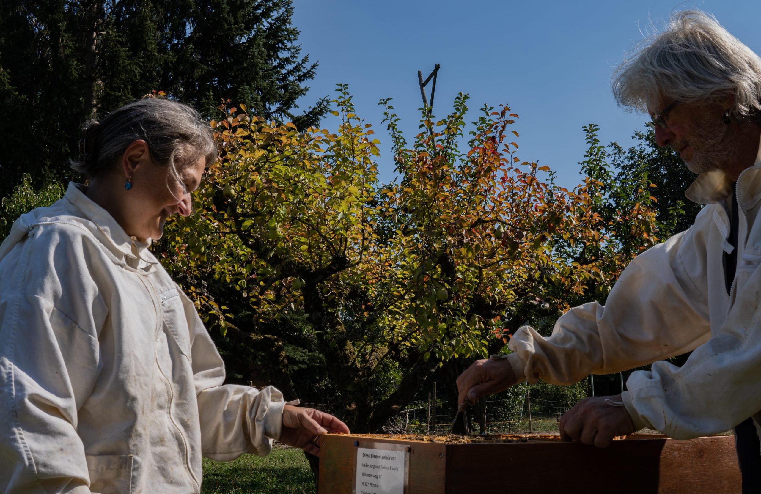 Einige Zeit nachdem wir mit dem Bewirtschaften des Grundstücks angefangen hatten, fiel Reiner auf, dass es früher in der Blütezeit viel mehr in den Bäumen gesummt hat. Tatsächlich waren viel weniger Bienen und andere Bestäuber zu sehen. Wir kamen deshalb auf die Idee, eine Imkerin auf das Grundstück zu holen.