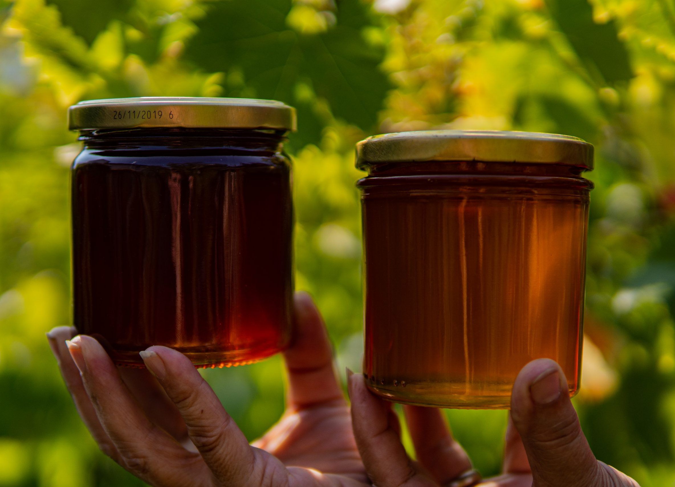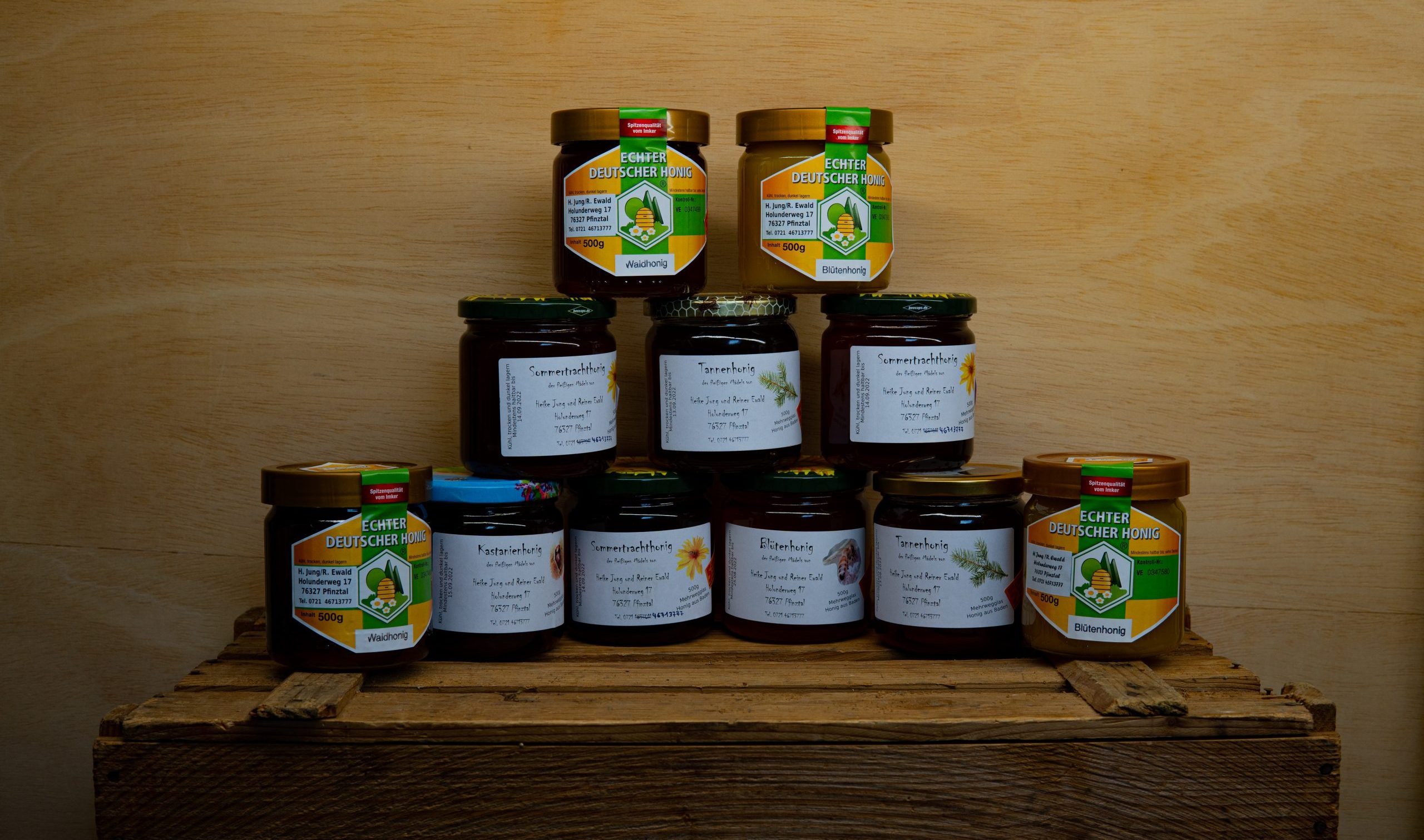 Das sind vor allem unsere verschiedenen Honigsorten in 500g-Gläsern.